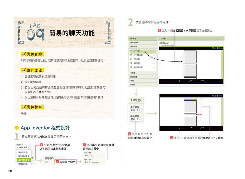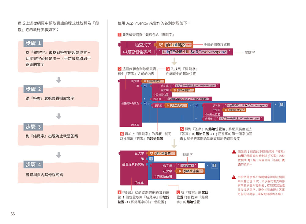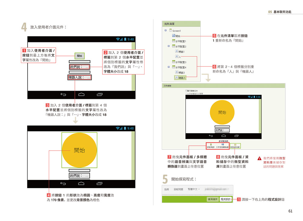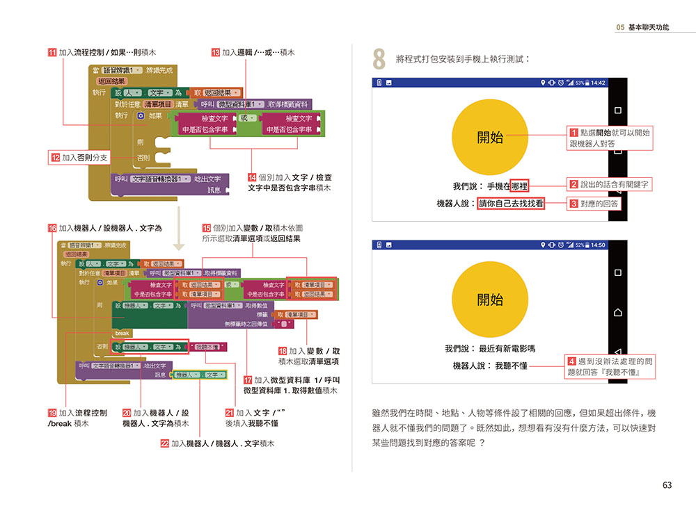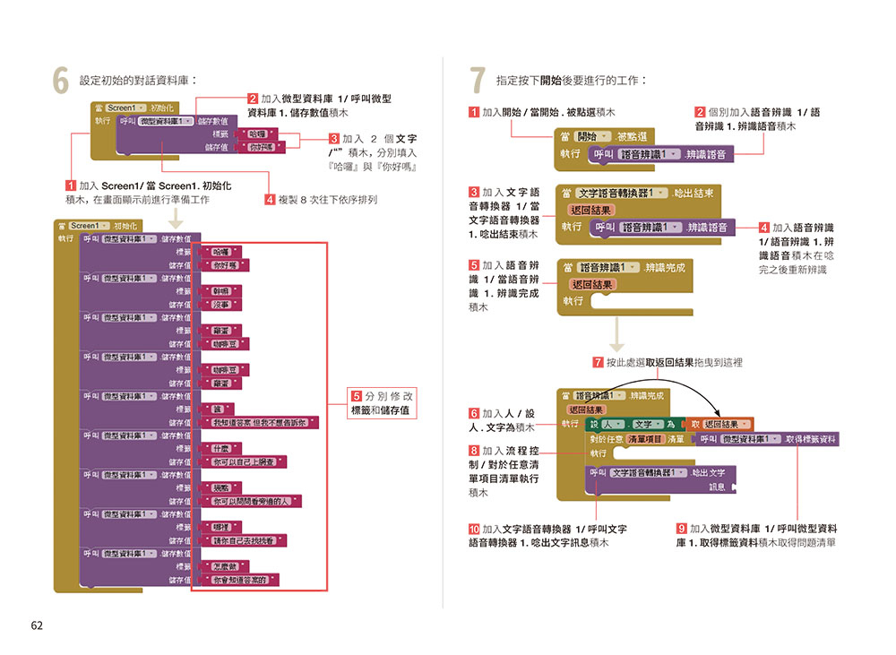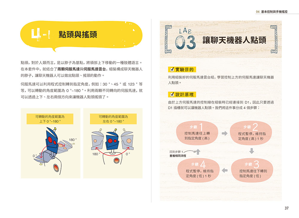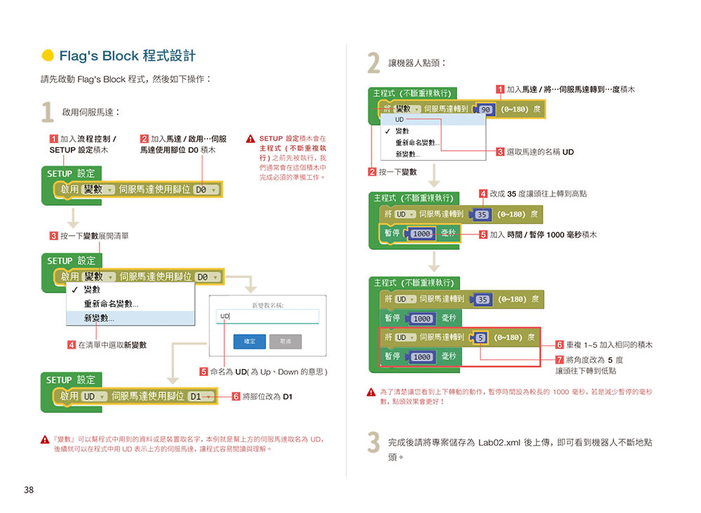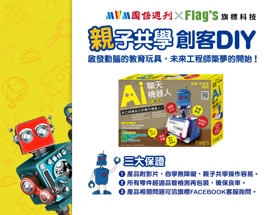 以上的這一些, 都可以透過撰寫程式客製化, 看到『寫程式』別緊張, 我們準備了 Flag`s Block 圖形化積木式環境, 只要用滑鼠拖放組合積木就可以完成各種變化的程式。在搭配套件的實驗手冊中, 包含有多個實驗範例, 從概念、原理、到實際動手, 帶著您了解怎麼用積木寫程式控制機器人。另外, 手冊中也會介紹 App Inventor 這套工具, 同樣使用組合積木的方式就可以設計手機 App, 快速做出可遙控、說話的機器人, 設計聊天機器人背後的強化學習機制 - 找出問題的最佳解答!