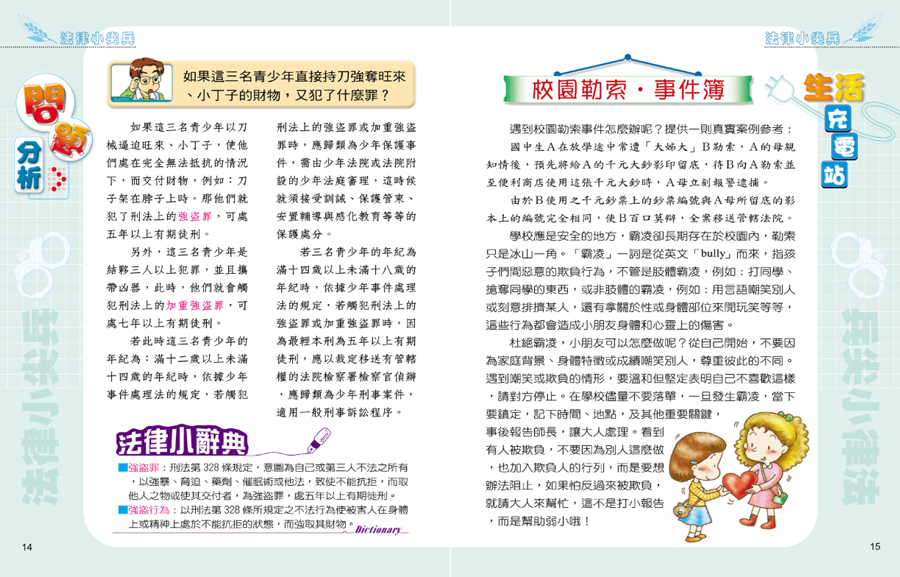 全套共4冊將法律條文與生活結合,成為實用的生活小常識以小朋友最喜歡的漫畫方式,擷取日常生活中可能發生的事件,以說故事告訴大家哪些行為是否構成違法,以及相關的法律規定及處罰內容從小培養正確的法治觀念