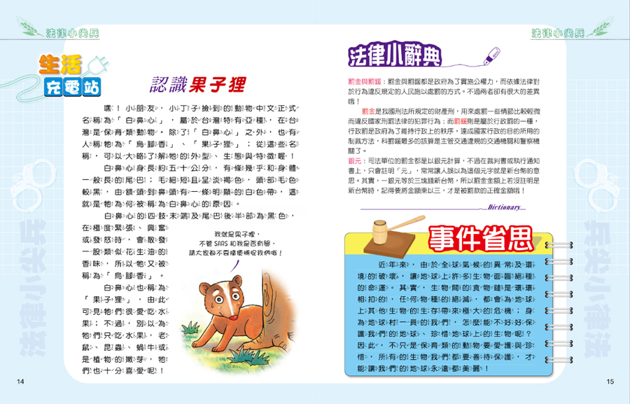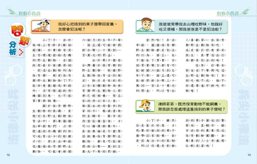 將法律條文與生活結合,成為實用的生活小常識以小朋友最喜歡的漫畫方式,擷取日常生活中可能發生的事件,以說故事告訴大家哪些行為是否構成違法,以及相關的法律規定及處罰內容從小培養正確的法治觀念