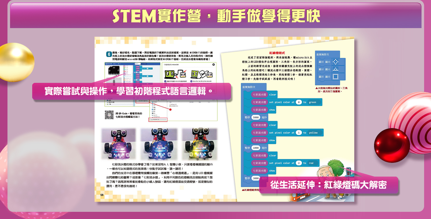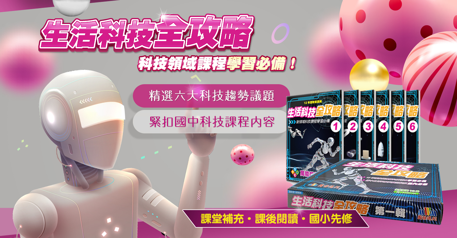 - 機器人任務中- 小幫手走迷宮● 玩具科技總動員- 舊玩具變科技了!- 玩具大改造- 小衣夾大學問- 自製公仔便條夾- 無所不在的槓桿- 厲害的太陽能板- 節能的空心杯馬達- 轉動模型直升機- 搭直升機去旅遊!- 燈光、開關與電池- 塑膠槌子會發光- 閃耀的彩蝶效應- 直升機大不同第2冊 AR擴增實境VR虛擬實境● AR 擴增實境- 抓寶旋風- 在虛實間的擴增實境- AR 遊戲潮- AR 軟體應用- 居家設計自己來- 博物館活起來- 用AR 認識鍬形蟲- 遊走在虛實之間● 虛擬實境再進化- 好厲害的眼鏡- 進入VR 世界- 虛擬實境的應用- 自己做VR 眼鏡- MR 混合實境- 立體的浮空投影- 一起玩浮空投影- 尋回失竊的VR 眼鏡第3冊 自造神器雷切機● 3D 列印新世界- 印刷牽動世界革命- 活字印刷的先驅- 輕鬆複製的影印機- 免製版可印的印表機- 立體呈現的3D 列印- 不簡單的印鈔術- 印刷的藝術版畫- 代表身分的印章- 印什麼都不奇怪- 我是小小設計師- 這樣也能印● 神乎其技的雷切- 雷切是什麼- 神奇的雷射- 用雷射來切割- 自製個性木杯墊- 產生器來幫忙- 自製鏤空雕花燈罩- 雷切花樣多- 揭開木窗的秘密第4冊 智能瓦力的動感光波● 自走科技智能瓦力- 當瓦力遇上瓦利- 無人駕駛的自走科技- 小心!無人車就在你身邊- 像車子的機器人- 不插電自走下坡- 無人車之父賽巴斯蒂安‧ 史朗- 發現瓦利- 瓦利的大腦Micro:bit- 來自地心的隱形力地球磁場- 幫忙找方向的電子羅盤- 自造指北針- 隨心所欲的車輪- 自造小馬達- 出乎意料的自走車● 自走科技智能會轉彎- 會呼吸的燈- 帶來新光源的光明使者- 瓦利的底盤開關- 會發聲的蜂鳴器- micro:bit 這樣玩- 來選個程式吧- 小綠人動起來- 指北針再進化第5冊 動畫與影像科技● 抓住瞬間的影像- 攝影科技大進化- 奇妙的視覺暫留- 自製動畫走馬盤- 藍與綠的背後- 主播體驗正流行- 我是新聞小主播● 有趣的動畫科技- 動畫的誕生- 動畫大世界- 逼真的電腦成像- 分鏡腳本怎麼寫- 捏塑一個牠- 自己拍逐格動畫- 觸動人心的宮崎駿第6冊 科技智慧廚房● 廚房科技大革命- 科技讓你秒變主廚- 廚房科技新趨勢- 水波爐大戰微波爐- 用微波做蛋糕- 廚房便利小工具- 用空氣來烹調- 自製氣炸洋芋片- 廚房裡的秘密● 智慧的廚房- 智慧廚房真方便- 見識廚房科技力- 廚房清潔妙法寶- 清潔泡泡藏玄機- 自製洗碗精- 智慧廚房是什麼- 自動感應燈模擬實作- 尋找自動咖啡機